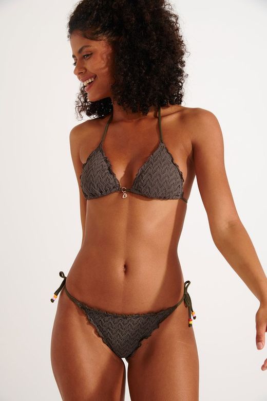 Это бикини не может отсутствовать в вашем гардеробе! Бюстгальтер раздвижного треугольного типа со съемными мягкими чашками идеально адаптируется к груди. Ткань, связанная крючком, красивая и является последней тенденцией, имеет волнистую отделку, которая придает ей очень оригинальный и женственный вид. Трусики бразильские, невысокие, узкие внизу, имеют боковые завязки для регулировки размера и такую же волнистую отделку, как и у бюстгальтера.